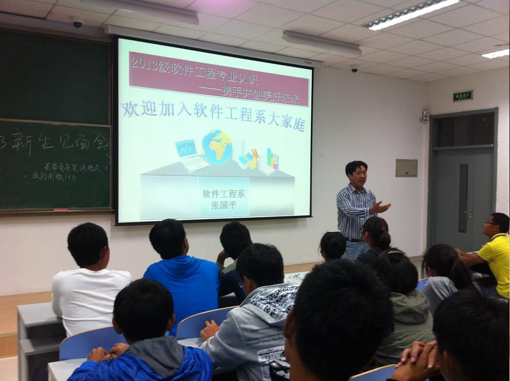 9月24日晚,软件工程系在南教211举行2013级新生专业教育暨班主任见面会。软件工程系张国平老师、崔学荣老师向大一新生进行了较为全面的专业教育,13级班主任吴春雷、张俊三、李坤等老师参加见面会。