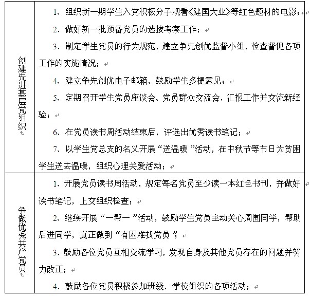 4)号召学生党员关心身边有困难的同学,帮助他们克服生活和学习中遇到的问题,使普通学生切实体会到党员的作用。