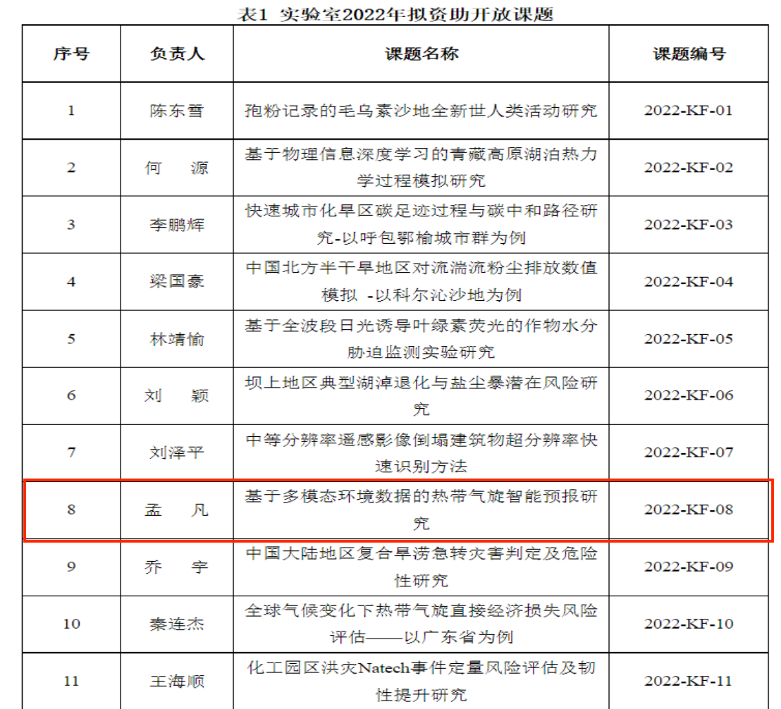 获批的环境演变与自然灾害教育部重点实验室开放课题项目名称为项目名称为“基于多模态环境数据的热带气旋智能预报研究”(项目编号:2022-KF-08)