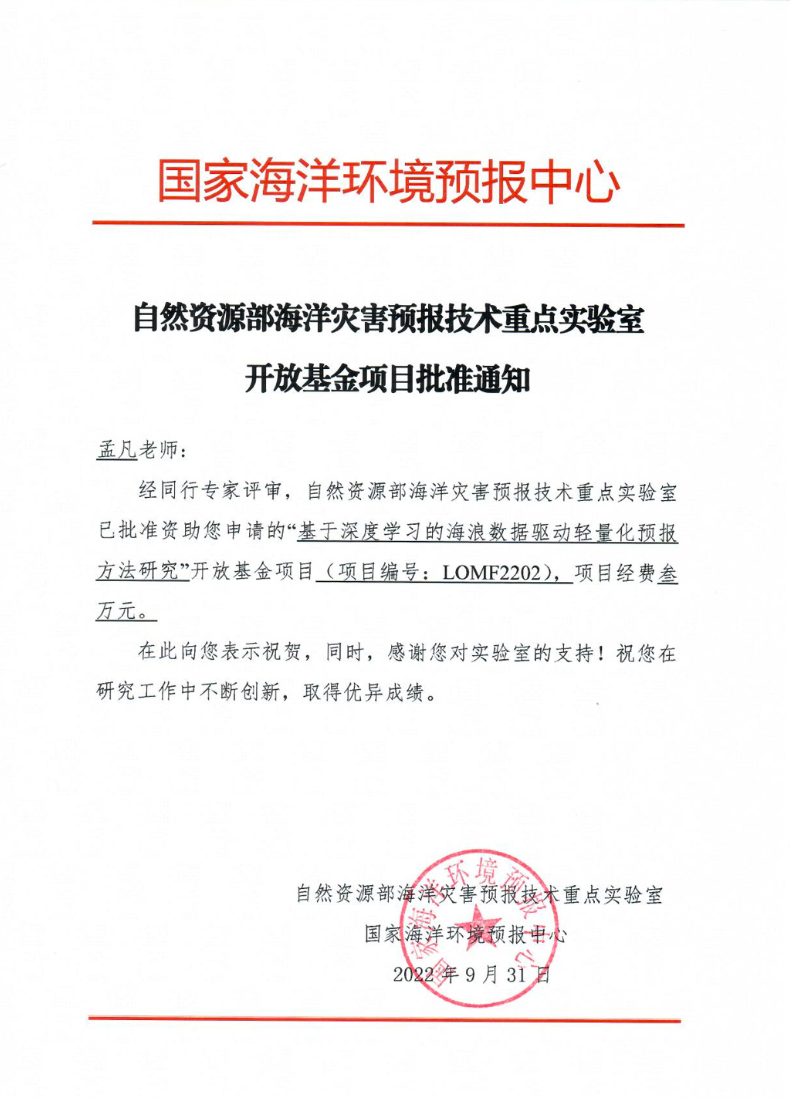 获批的自然资源部海洋灾害预报技术重点实验室开放基金课题项目名称为“基于深度学习的海浪数据驱动轻量化预报方法研究”(项目编号:LOMF2202)。项目合作者为国家海洋环境预报中心正高级工程师王久珂。