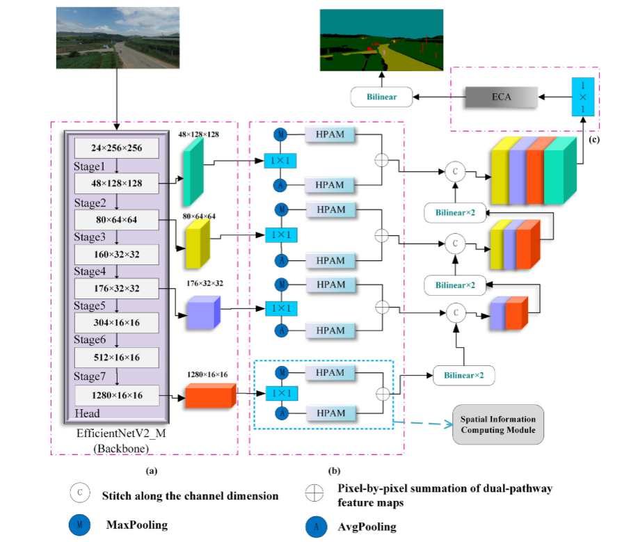 在无人机航拍领域,由于部分小目标在高分辨率图片中占比非常小分割难度大。针对这些小目标难以分割的问题,本文提出一种新型的语义分割网络模型,其中通过设计新的空间计算模块来提高小目标的分割效果。我们选取训练速度快和特征提取效果好的EfficientNetsV2作为网络的主干网络;另外我们发现传统的池化方式会导致空间位置、目标边缘等像素信息的丢失,这不利于空间信息的计算,故设计了一种基于希尔伯特曲线遍历的图像降维算法,并将其应用到空间计算模块中作为网络的特征增强模块。最后,我们利用跳跃连接以及ECANet组成新的解码器进行高、底层特征图的融合,这样的网络结构可以在保证增加少量网络参数的情况下解决高分辨率图像中小目标分割效果不好的问题。
