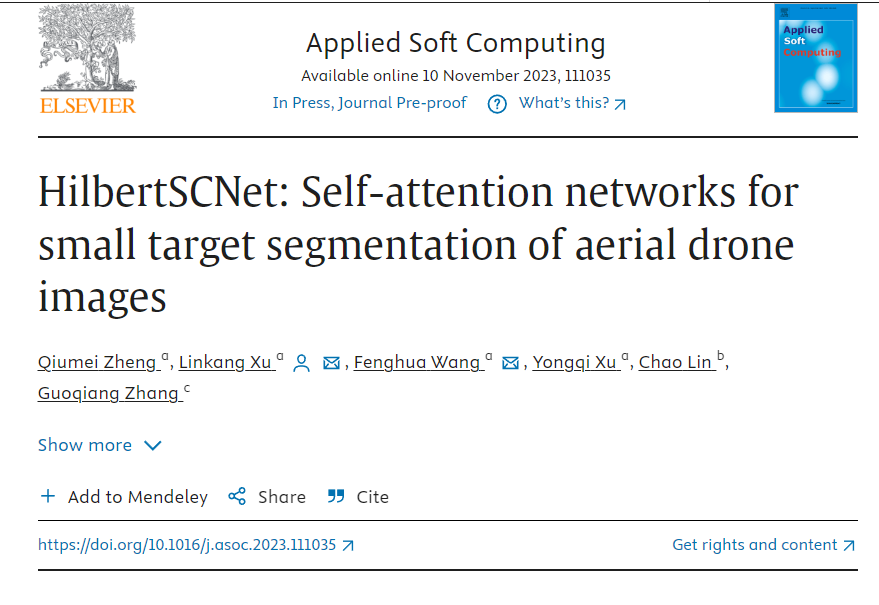 我院教师郑秋梅、硕士生徐林康在中科院大类分区2区TOP期刊《Applied Soft Cpmputing》发表题为“HilbertSCNet: Self-attention networks for small target segmentation of aerial drone images”的研究龙8在线登录官网-龙8(中国)。《Applied Soft Cpmputing》2023年影响因子为8.7,近五年平均影响因子为7.9,为中国石油大学(华东)T2期刊。