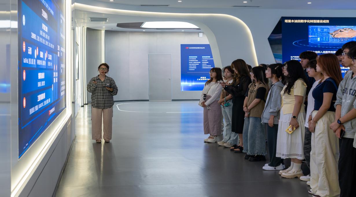 在昆仑数智,公司负责人介绍了企业在能源数字化转型中的战略定位与实践路径。调研组参观了企业文化墙与智慧能源技术展示区,系统了解“智慧油田数字孪生系统”的研发思路与部署应用情况。工作人员通过演示能源大数据平台运行流程,向大家展示了数字孪生技术在油田生产调度、设备运维、远程管理等方面的核心作用,该系统实现了运维成本降低20%、响应效率显著提升的目标。