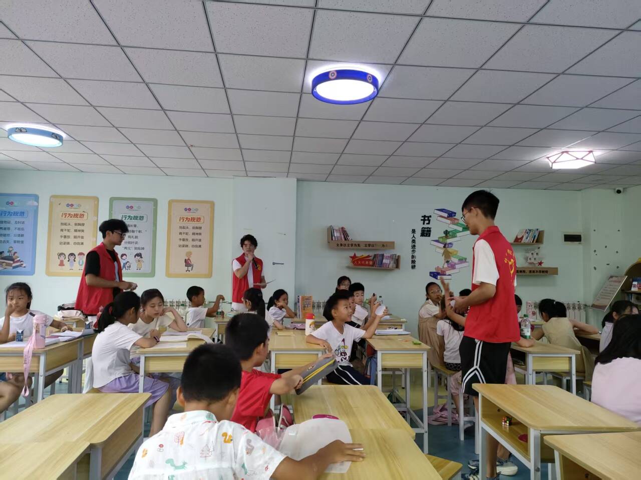 图三:袁建强、靳悦、郭泽源在课程上与孩子们互动