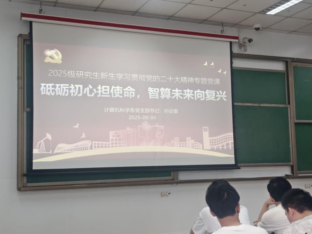 为全面贯彻党的教育方针,深入落实立德树人根本任务,扎实推进研究生新生思想政治教育工作,9月4日,青岛软件学院、计算机科学与技术学院于东环 201教室举办“砥砺初心担当使命,智算未来复兴”专题党课讲座。学院计算机科学系孙运雷书记担任主讲嘉宾,2025 级全体研究生新生参加讲座,学院研究生辅导员游应红主持本次讲座。
