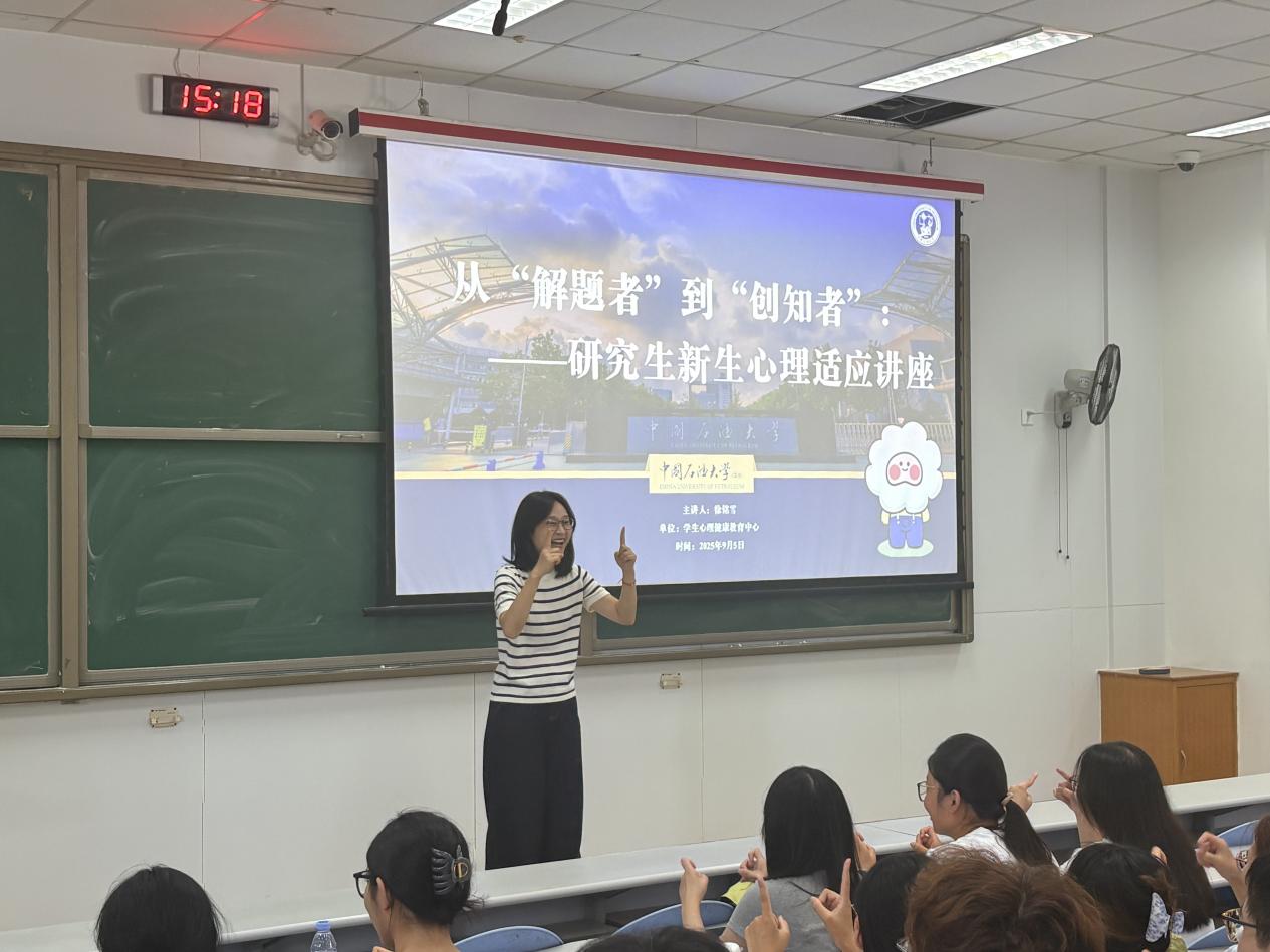 9 月 5 日,学生心理健康教育中心徐铭雪老师以 “从‘解题者’到‘创知者’” 为主题,为新生开展研究生心理适应专题讲座,帮助新生破解科研阶段可能面临的心理困惑,以健康心态开启研究生生活。